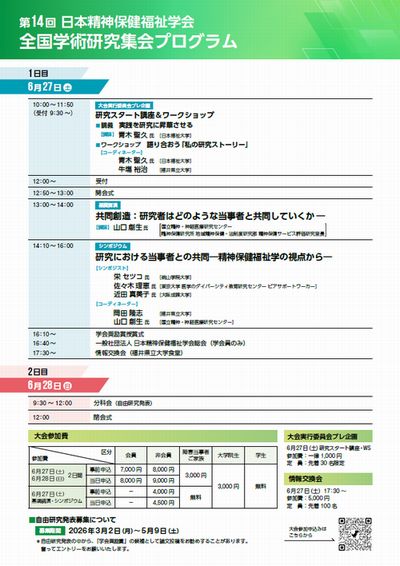 開催日 : 2026(令和8)年 6月 27日(土)、28日(日)の2日間 開催場所 : 福井県立大学 永平寺キャンパス(両日とも) 福井県吉田郡永平寺町松岡兼定島4-1-1 開催校 : 公立大学法人 福井県立大学 大会長 : 岡田 隆志(福井県立大学看護福祉学部:本学会理事) チラシは、以下のチラシ(縮小)をクリックしてください。