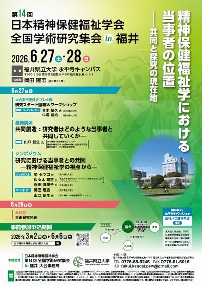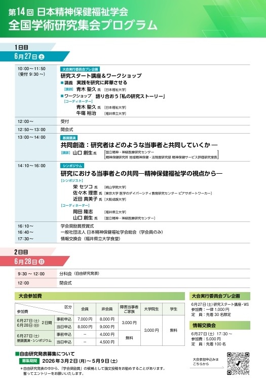 ![]() 開催要項はこちら ⇒ 参加申し込み こちらのURLからお申し込みください。Peatix(オンラインイベント管理サービス)を利用しています。 申し込み期間 2026年3月2日(月)~6月6日(土) hpps://2026fukui.peatix.com/ ![]() *大会チラシの二次元コードからもお申し込みいただけます。 演題募集期間 2026年3月2日(月)~5月9日(土) ・自由研究発表演題募集要項はこちらをクリックしてください。 ⇒ ・演題抄録フォーム(MS-Word) ⇒ ![]() ・記入に当たっての参考書式 ⇒ |